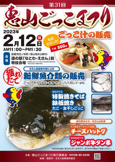 ごっこ汁の販売(1杯300円)や、人気グルメの出店、えさん漁協青年部による新鮮な魚介類、焼きそば・鉄板焼きの販売など、例年大人気のイベントです。販売品には数に限りがありますので気になる方はお早めに!屋外会場ですので暖かい服装でおでかけください♪※天候によりイベントが中止になる場合がありますのであらかじめご了承ください。