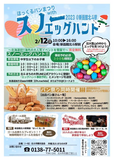 海外で大人気のイベント【スノーエッグハント】は北海道初開催!巨大な雪山からエッグを見つけよう!大当たりの卵も隠れていますよ♪中身は開けてからのお楽しみ!【パン祭り】も同時開催♪道南各地の美味しいパンが勢揃いです。隣接する「ほっくる」内には、段ボールで作られた【巨大迷路】(無料・予約不要)や、占い師勢揃いの【迷宮の館】(有料・予約不要)も登場。ご家族皆さんで楽しめるイベントです。スノーエッグハントは限定300名様(中学生以下のお子さま対象)。気になる方は予約はお早めに♪