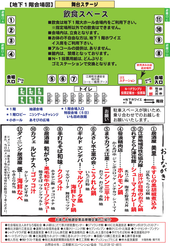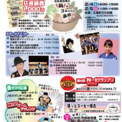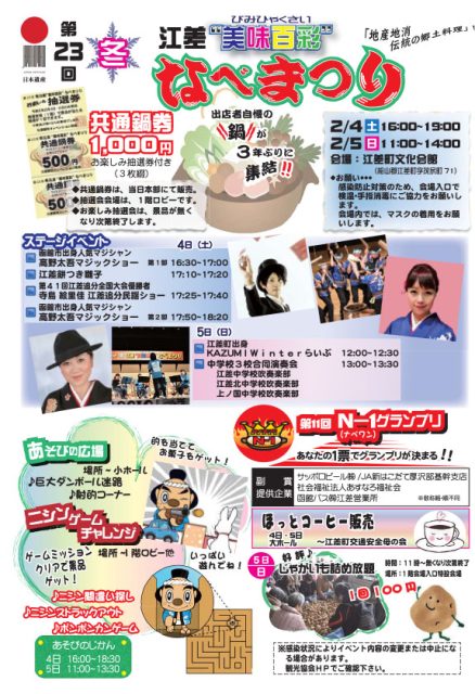 コロナ対策のため今回は、立食・アルコールの提供はございませんが出店者自慢の「鍋」をゆっくり堪能していただきたいと思います。また、冬の江差で子供たちに楽しんで頂きたいという思いで、「遊びの広場」を作り、景品が当たる射的、巨大ダンボール迷路。「ニシンゲームチャレンジ」は、江差町ならではのチャレンジゲームとなっています。幼児から高学年の子供さん達向けに企画しております。N-1グランプリは、以前のどんぶりの器を使った投票から、今回は投票用紙による投票となります。マジックショーや江差追分民謡や地元中学生による吹奏楽演奏などのステージイベントも行われます。イベント時は、スタッフ・参加店一同コロナウイルス感染対策を万全にして皆様のお越しをお待ちしております。