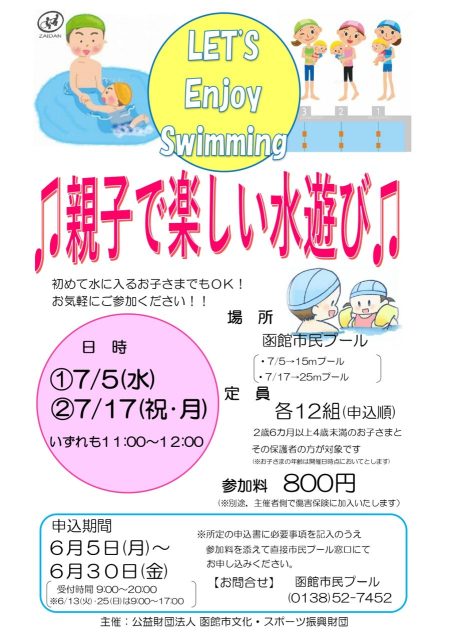 申込受付 申込期間6月5日(月)~6月30日(金)までに、所定の申込書に必要事項を記入のうえ、参加料を添えて直接市民プール窓口にてお申込みください。