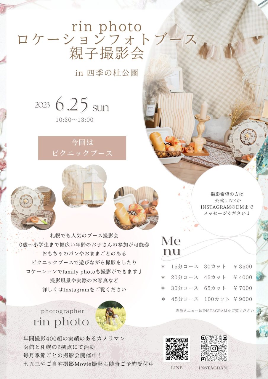 函館と札幌の2拠点で活動し、年間撮影400組の実績のあるカメラマン「rin photo」の親子撮影会です♪