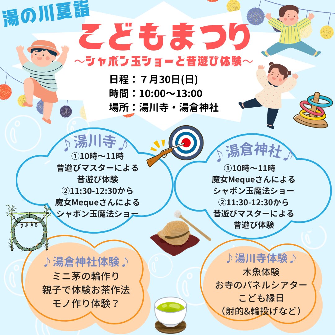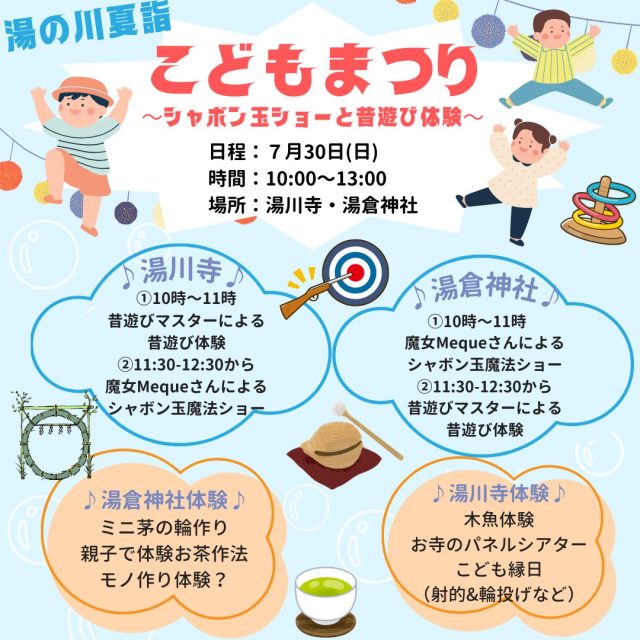 湯の川夏至 こどもまつり イベント 2023.07.28 2023年7月30日(日) 開催場所 湯川寺・湯倉神社 湯川寺・湯倉神社の夏詣コラボ企画第二弾! 様々な体験やシャボン玉ショー、昔遊びを楽しむことができます♪ 時間 10:00~13:00 夏のお寺や神社で昔遊びができるなんて、いい思い出になりそうです♪ \湯倉神社/ Twitter Instagram \湯川寺副住職 筒井章順さん/ Twitter Instagram ※このイベントは終了しました※