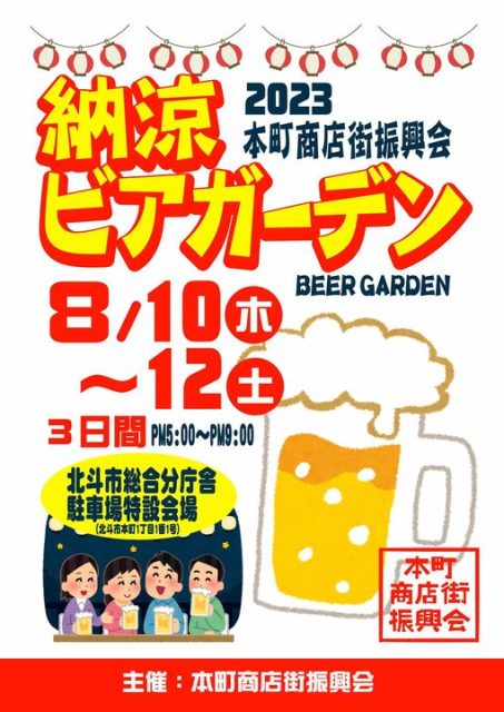 【北斗市】納涼ビアガーデン イベント 2023.08.08 2023年8月10日(木)~2023年8月12日(土) 開催場所 北斗市総合分庁舎の駐車場特設会場 北斗市の本町商店街でビアガーデンを開催! 暑い夏にビールを飲んでスッキリ!いいですね♪ 時間 17:00~21:00 ※このイベントは終了しました※