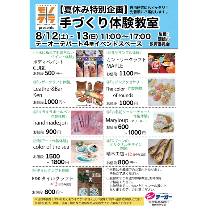 また、箸の絵付けやキャンドルづくりなどの体験型のお店や、黒板作りや電子工作のワークショップなどもあります。親子で一緒に参加してみては?♪