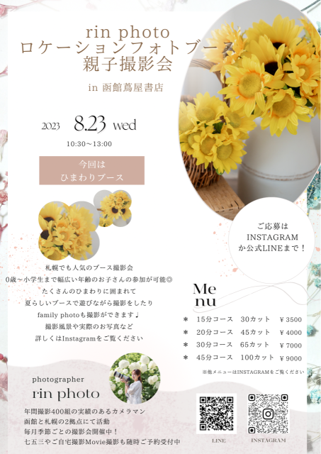 函館と札幌の2拠点で活動し、年間撮影400組の実績のあるカメラマン「rin photo」の親子撮影会です♪