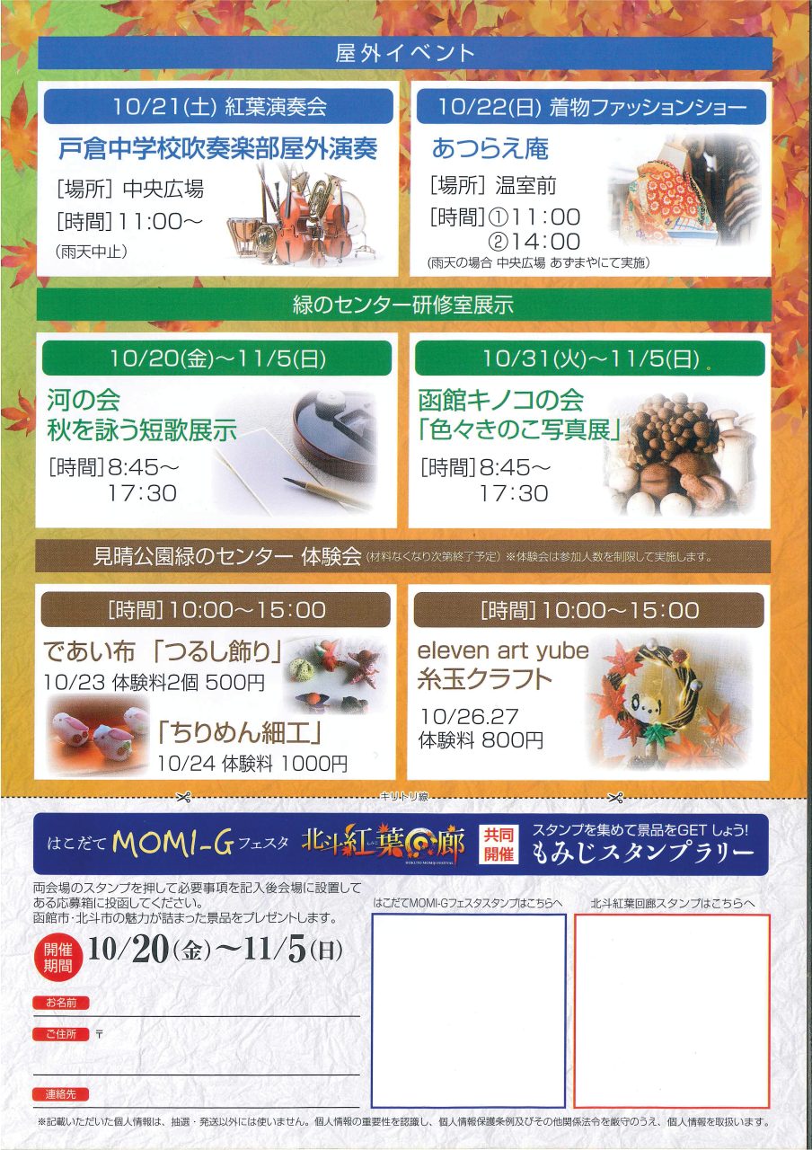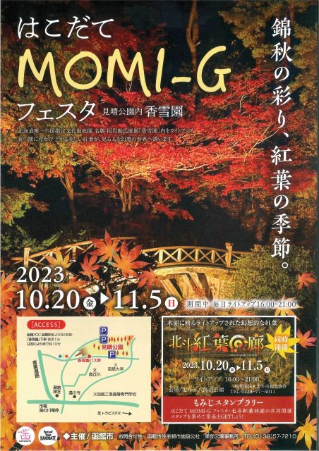 はこだてMOMI-G(もみじ)フェスタ イベント 2023.10.12 2023年10月20日(金)~2023年11月5日(日) 開催場所 見晴公園 (香雪園) 紅葉の名所として知られる香雪園のイベント。 期間中は、約100メートル続くカエデ並木などを毎日ライトアップ🍁✨ 園内は幻想的な雰囲気に包まれます。 紅葉演奏会や「色々きのこ写真展」、スタンプラリーも開催されていますよ🍂 時間 16:00~21:00 ※このイベントは終了しました※