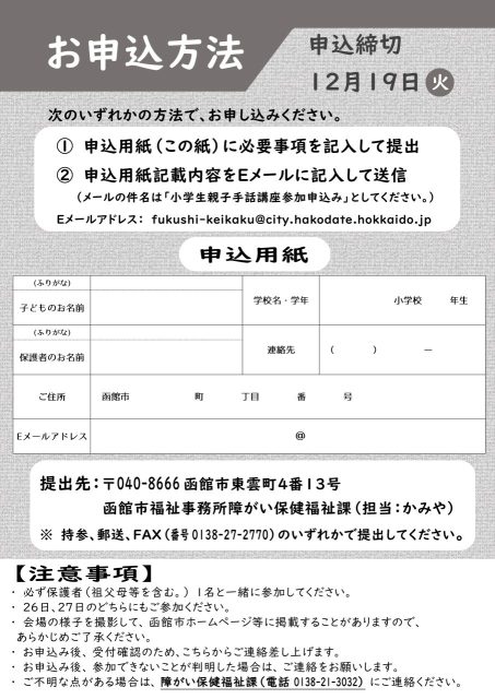 ②申込用紙記載内容をEメールに記入して送信(メール件名は「小学生親子手話講座参加申込み」としてください)