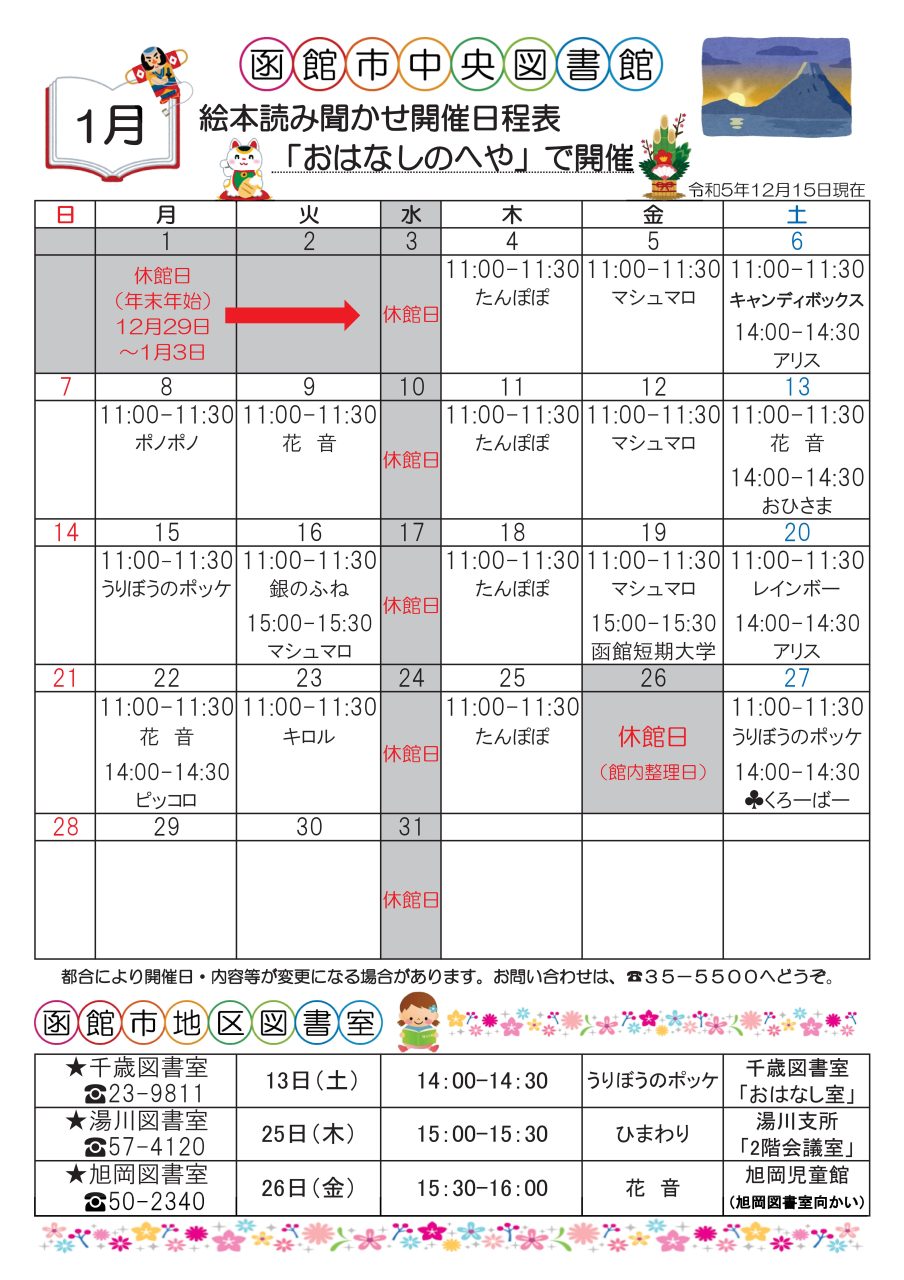 【函館市中央図書館】1月の絵本読み聞かせ日程 イベント 2023.12.18 2024年1月4日(木)~2024年1月28日(日) 開催場所 函館市中央図書館・千歳図書室・湯川図書室・旭岡図書室 函館市中央図書館、函館市地区図書室の2024年1月の絵本読み聞かせ開催日程です♪ 時間 カレンダーをご確認ください。 ※都合により開催日・内容などが変更になる場合があります。 ままっち!でも毎月お知らせしますのでチェックしてお出かけしてね♪ ※このイベントは終了しました※
