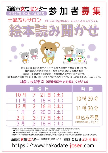 【函館市女性センター】1月の絵本読み聞かせ イベント 2023.12.21 2024年1月6日(土)~2024年1月20日(土) 開催場所 函館市女性センター 開催日 1月6日(土)20日(土) 「絵本の読み聞かせ」の後は、親子で手作りおもちゃ作りもしますよ♪ 親子で楽しい時間を過ごしましょう♪ 時間 10:30~11:30 対象 未就学児(保護者同伴でお越しください) 参加料 無料 申込受付 お申込み不要です。時間内にお越しください。 ※このイベントは終了しました※
