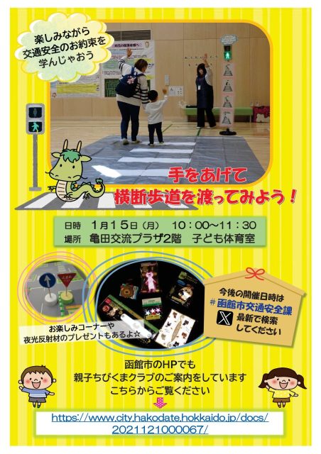 横断歩道と信号機を設置し、「止まる・見る・待つ」など横断歩道の渡り方を親子で楽しく体験できます。