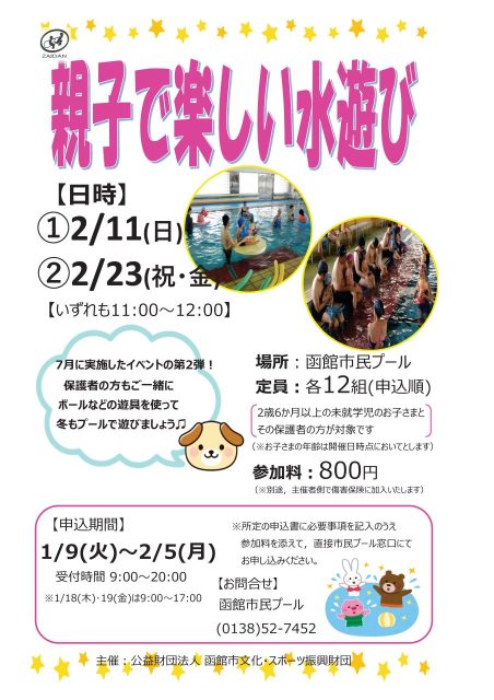 申込受付 申込期1月9日(火)~2月5日(月)までに、所定の申込書に必要事項を記入のうえ、参加料を添えて直接市民プール窓口にてお申込みください。