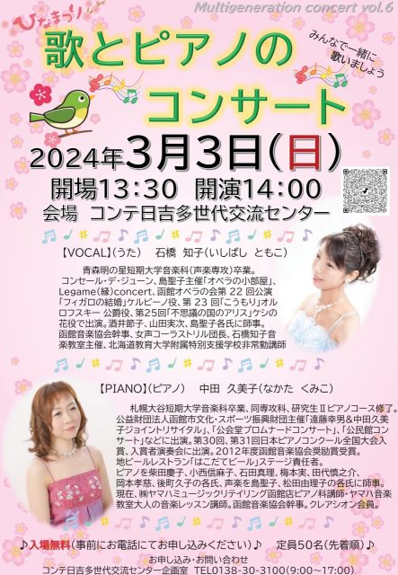 石橋知子(いしばしともこ)さんによる歌と、中田久美子(なかたくみこ)さんによるピアノのコンサート♪