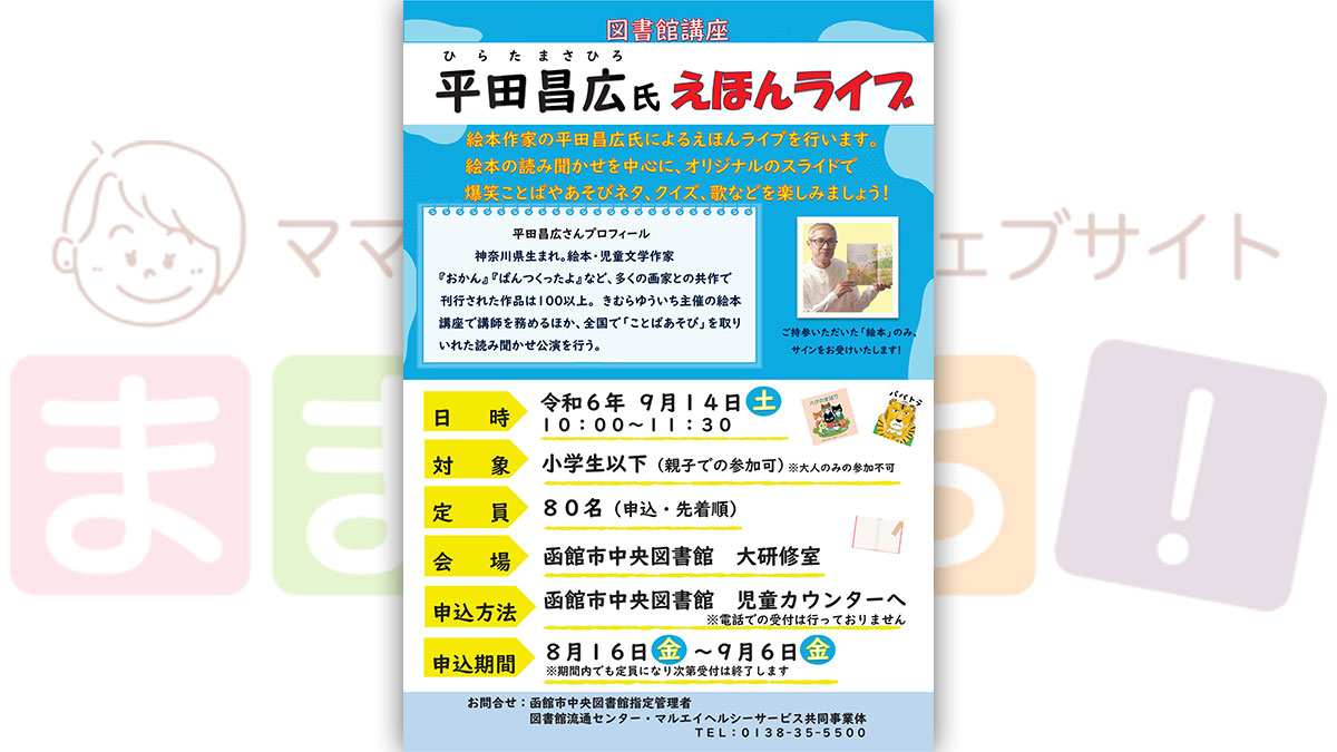 【函館市女性センター】9月の絵本読み聞かせ イベント 2024.08.01 2024年9月7日(土)~2024年9月21日(土) 開催場所 函館市女性センター 開催日 9月7日(土)21日(土) 「絵本の読み聞かせ」の後は、親子で手作りおもちゃ作りもしますよ♪ 親子で楽しい時間を過ごしましょう♪ 時間 10:30~11:30 対象 未就学児(保護者同伴でお越しください) 参加料 無料 申込受付 お申込み不要です。時間内にお越しください。 ※このイベントは終了しました※