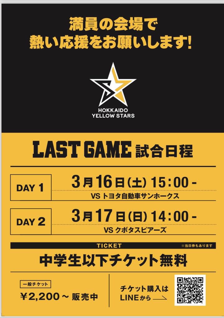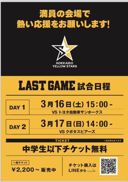 ※チケット購入など詳細については北海道イエロースターズHPをご覧ください。