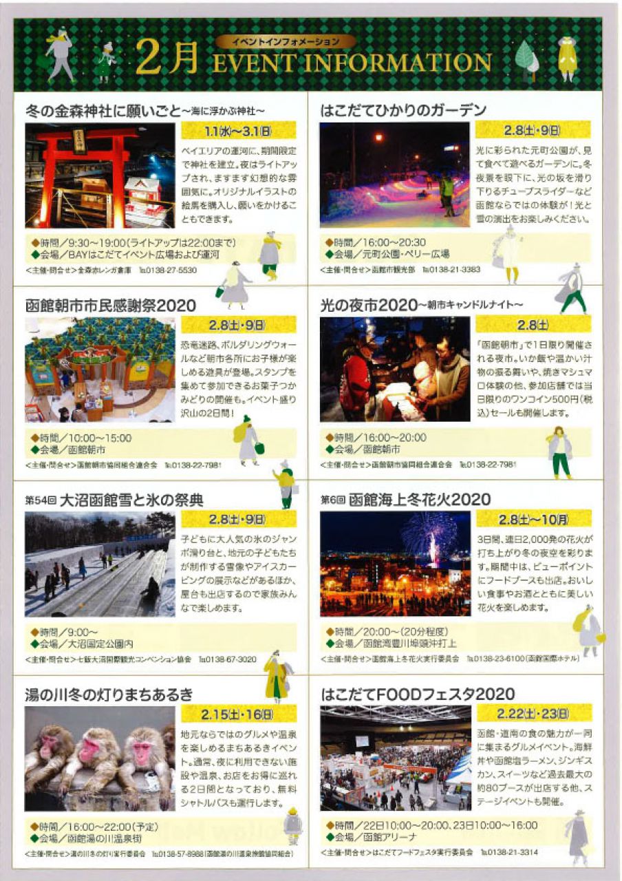 函館朝市 市民感謝祭 イベント 2020.01.20 2020年2月8日(土)~2020年2月9日(日) 開催場所 函館朝市 恐竜迷路、ボルダリングウォールなど朝市各所にお子様が楽しめる遊具が登場。スタンプを集めて参加できるお菓子つかみどりの開催も。イベント盛りだくさんの2日間! 時間 10:00~15:00 ※このイベントは終了しました※
