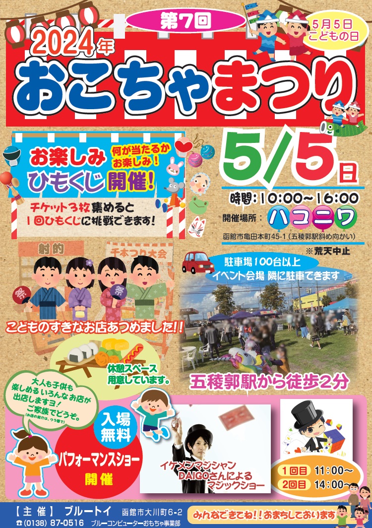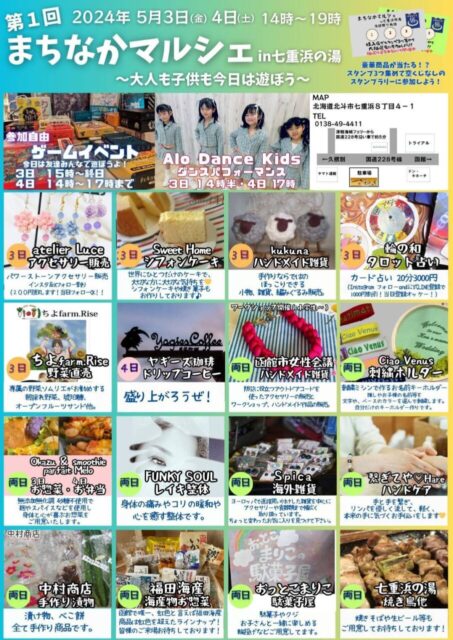 まちなかマルシェ イベント 2024.04.11 2024年5月3日(金)~2024年5月4日(土) 開催場所 七重浜の湯 七重浜の湯にて、大人も子供も楽しめる「まちなかマルシェ」が開催されます! 食べ物・雑貨・美容など、ゲームイベントやダンスパフォーマンスもございますので、 是非見に行ってみてくださいね♪ スタンプを3つ集めて空くじなしの抽選に参加できるスタンプラリーも開催♪豪華商品が当たるかも!? 時間 14:00~19:00 ※このイベントは終了しました※