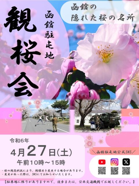 函館駐屯地 観桜会 イベント 2024.04.22 2024年4月27日(土) 開催場所 陸上自衛隊 函館駐屯地 今年も4月27日(土)函館駐屯地で観桜会を開催します! 桜をバックに自衛隊車両と写真が撮れるフォトスポットや、函館地方協力本部の広報ブースもあります♪ 駐屯地のきれいな桜、是非観に来てくださいね☆ 時間 10:00~15:00 ※駐車場に限りがありますので、徒歩または公共交通機関でお越しください。 桜をゆっくり見るなら函館駐屯地🌸 \函館駐屯地 公式SNS/ Instagram X ※このイベントは終了しました※