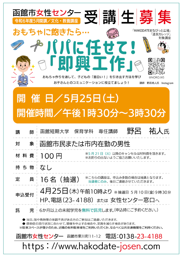申込受付 4月25日(木)10:00より、HP、電話または女性センター窓口にてお申し込みください。