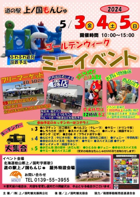 【道の駅 上ノ国もんじゅ】ゴールデンウイークミニイベント イベント 2024.05.01 2024年5月3日(金)~2024年5月5日(日) 開催場所 道の駅 上ノ国もんじゅ 屋外特設会場 毎年恒例の上ノ国町内出店者の露店、フリーマーケット(5/4・5/5のみ)を開催!会場で1,000円以上のお買い物で特産品が当たるガラガラ抽選が出来ます!ふわふわ遊具も設置予定(無料で遊べます) さらに、毎日キッチンカーが多数出店!さらにさらに、カミゴンも遊びに来てくれます! GWはもんじゅに遊びに来てねー! 時間 10:00~15:00 少し遠めのお出かけにピッタリ♪ ※このイベントは終了しました※
