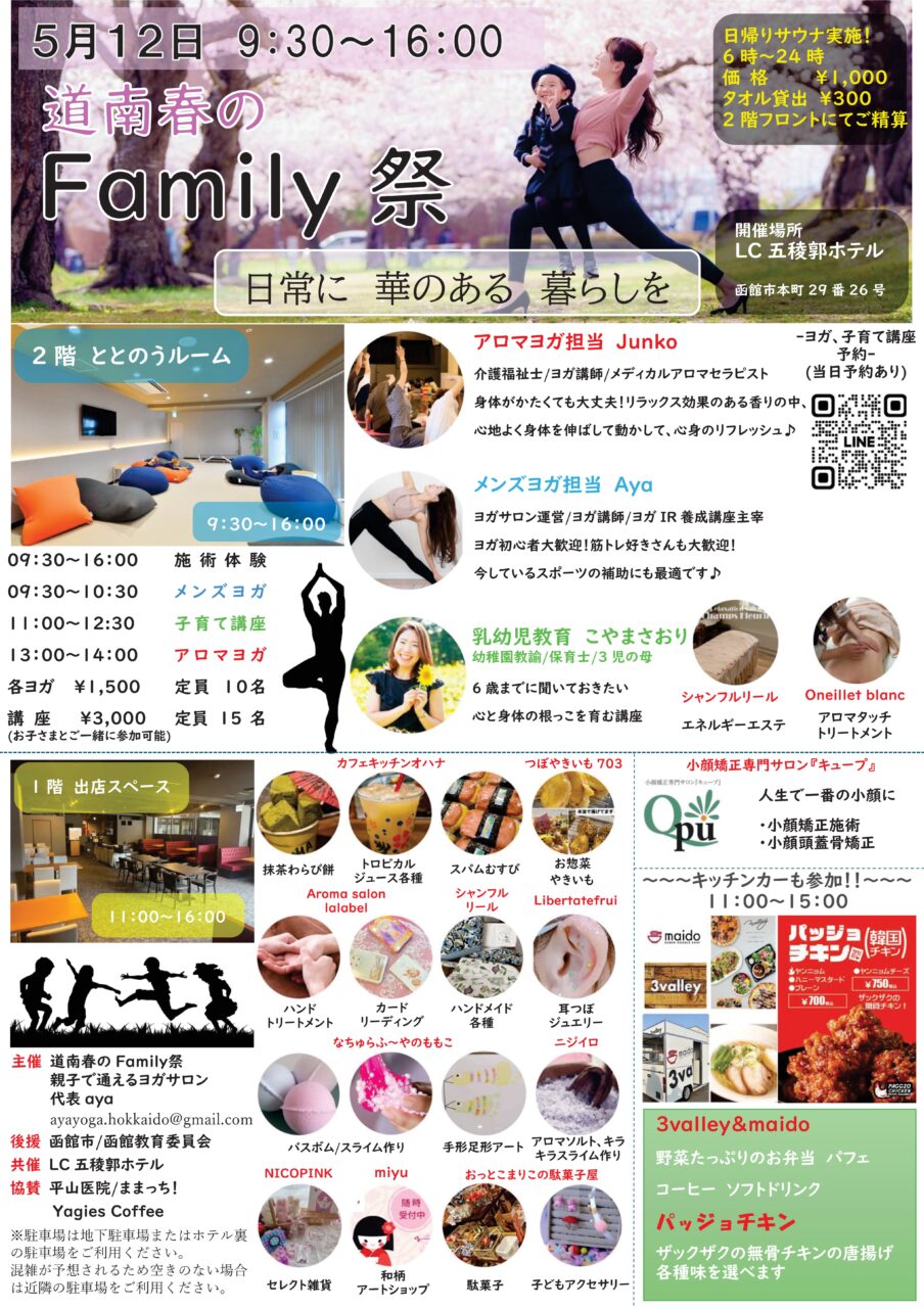 5/12(日)母の日に開催される【道南 春のFamily祭】イベントにて、アロマヨガを担当するjunkoです。