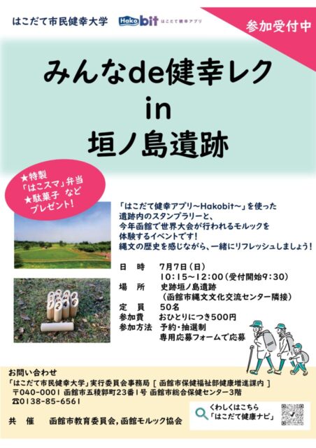 「はこだて健幸アプリ~Hakobit~」を使った遺跡内のスタンプラリーと、今年8月に函館で世界大会が行われるモルックを体験するイベントです。