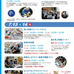 その他にも、有人潜水調査船(しんかい6500)の元パイロットによる講演や水圧実験、世界の海を巡った研究者による講演と実験で「海の流れ」や「海に起きている異変」についてなど学びのイベントもあります!