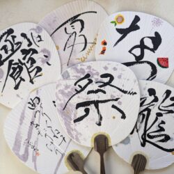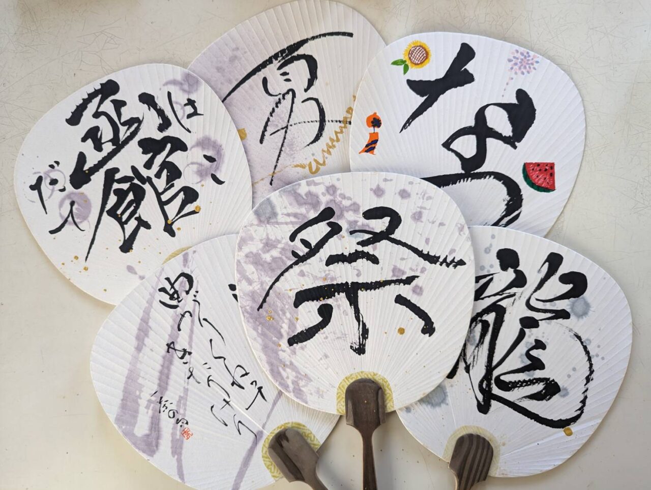 書道で使用する筆を使ってうちわに好きな文字を書きます。書の体験ができて素敵なうちわをお持ち帰りいただけるワークショップ。子供も大人もどなたでも大歓迎!