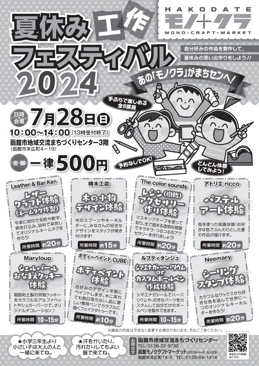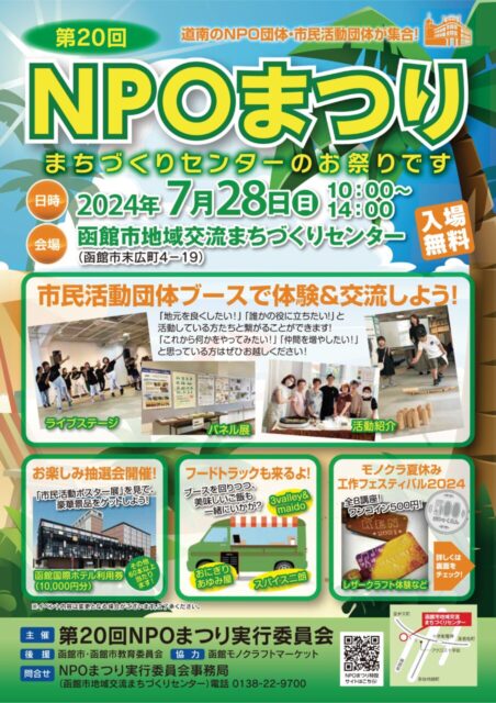 第20回 NPOまつり・夏休み工作フェスティバル2024 イベント 2024.07.22 2024年7月28日(日) 開催場所 函館市地域交流まちづくりセンター 道南のNPO団体・市民活動団体が集合する、第20回NPOまつり。 ライブステージやパネル展、活動団体の紹介コーナーや体験会など、様々な活動をしている方たちとの体験&交流ができます! 同時開催の「夏休み工作フェスティバル2024」では、一律500円でできるものづくり体験もできますよ♪ 時間 10:00~14:00 参加料 入場無料 ワークショップ参加予定の子は汗をかいたり、汚れたりしてもいい服で来てね♪ ※このイベントは終了しました※