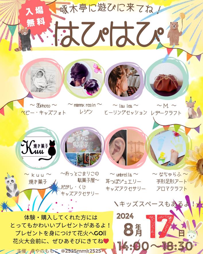 啄木亭に遊びに来てね!「はぴはぴ」 イベント 2024.07.22 2024年8月17日(土) 開催場所 函館湯の川温泉 湯元 啄木亭 はぴはぴ、今夏も開催! キッズフォトや手形足型アートなど、親子で楽しめるワークショップです♪ 花火大会前に、ぜひ気軽に遊びに来てください✨ 時間 14:00~18:30 体験・購入してくれた方にはかわいいプレゼントがあるみたいですよ♪ ※このイベントは終了しました※