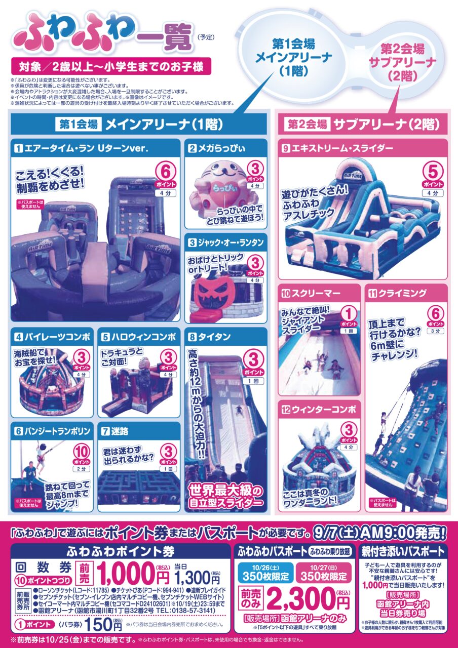参加料 入場無料 (ふわふわで遊ぶにはポイント券またはパスポートが必要です)