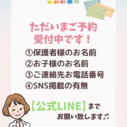 申込受付 公式LINEにて【①保護者様のお名前 ②お子様のお名前 ③ご連絡先お電話番号 ④SNS掲載の有無】をご入力の上お申込みください。