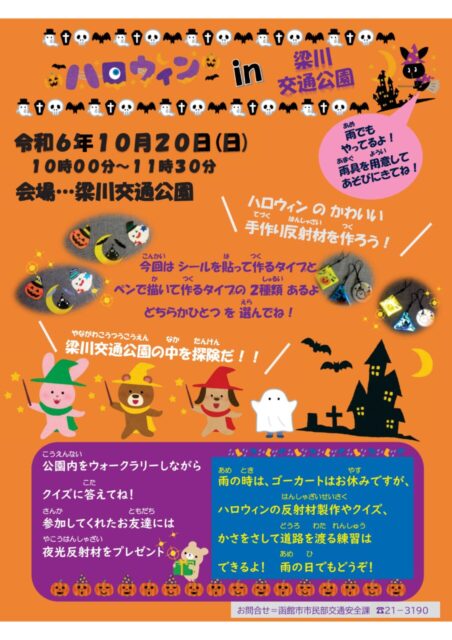 ハロウィンin梁川交通公園 イベント 2024.10.08 2024年10月20日(日) 開催場所 梁川交通公園 梁川交通公園の中を探検だ!! 公園内をウォークラリーしながらクイズに答えてね♪ 参加してくれたお友だちには夜光反射材をプレゼント。 雨の時はゴーカートはお休みですが、反射材製作やクイズ、傘をさして道路を渡る練習はできるよ! 時間 10:00~11:30 雨の日でも開催するので、雨具を持って参加しよう♪ ※このイベントは終了しました※