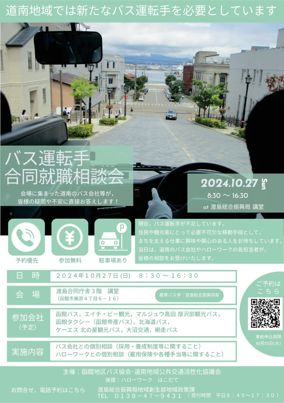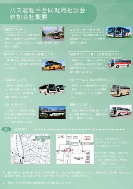道南地域のバス会社がブースを設置して人事担当者から採用条件や養成制度など各種相談にお答えします。