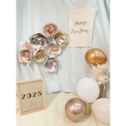 ナチュラルなお花のブース🌼です! シンプルでも⭕️ 年賀状にも使えるようにタペストリーもご用意! お誕生日のためのバースデーグッズもございます☺️