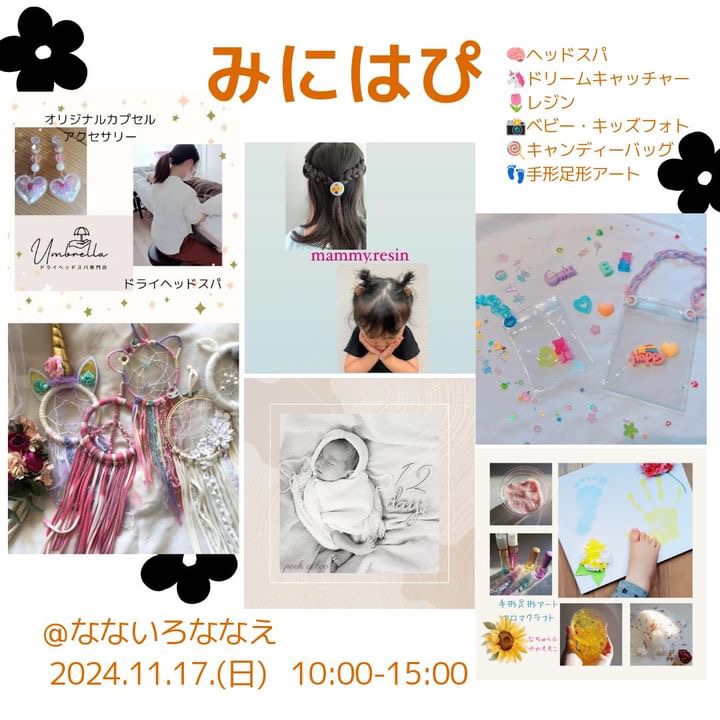 みにはぴ イベント 2024.11.06 2024年11月17日(日) 開催場所 道の駅 なないろ·ななえ(室内イベントスペース) 今回は、キャンディーバッグとドリームキャッチャーのお店が初出店! 🧠ヘッドスパ 🦄ドリームキャッチャー 🌷レジン 📸ベビー・キッズフォト 🍭キャンディーバッグ 👣手形足形アート ぜひぜひ遊びにきてね♪ 時間 10:00~15:00 小さなお子さんでも体験できるメニューです♪ ※このイベントは終了しました※