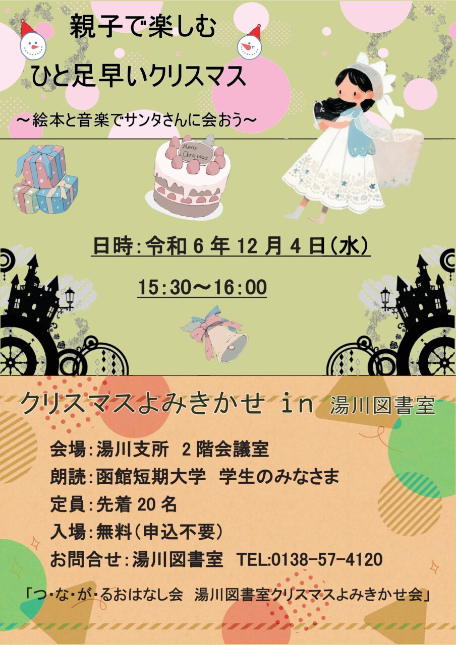 クリスマス読み聞かせ in 湯川図書室 イベント 2024.11.18 2024年12月4日(水) 開催場所 湯川支所 2階会議室 親子で楽しむひと足早いクリスマス 函館短期大学の学生の皆さまによるお話会です♪ 絵本と音楽でサンタさんに会おう♪ 時間 15:30~16:00 入場料 無料(申し込み不要) 定員 先着20名 クリスマス本番まで、イベントに参加して親子でワクワク感を楽しむのもいいですね♪ ※このイベントは終了しました※