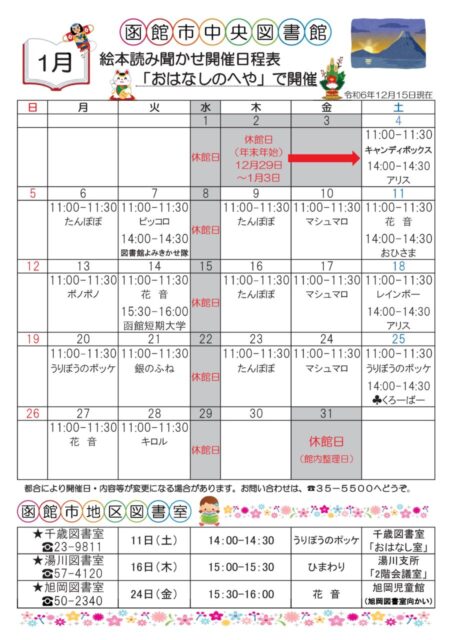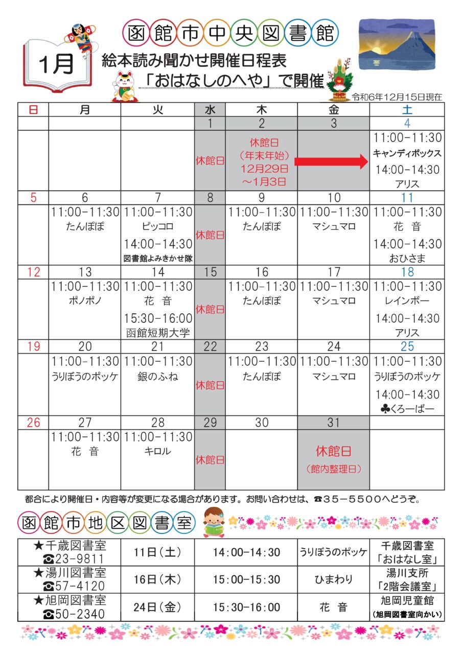 【函館市中央図書館】2025年1月の絵本読み聞かせ日程 イベント 2024.12.16 2025年1月4日(土)~2025年1月28日(火) 開催場所 函館市中央図書館・千歳図書室・湯川図書室・旭岡図書室 函館市中央図書館、函館市地区図書室の2025年1月の絵本読み聞かせ開催日程です♪ 時間 カレンダーをご確認ください。 ※都合により開催日・内容などが変更になる場合があります。 2025年もままっち!にて毎月お知らせしますのでどうぞよろしくお願いします✨ ※このイベントは終了しました※