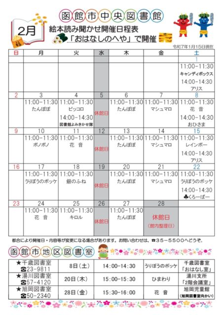 【函館市中央図書館】2月の絵本読み聞かせ日程 イベント 2025.01.20 2025年2月1日(土)~2025年2月28日(金) 開催場所 函館市中央図書館・千歳図書室・湯川図書室・旭岡図書室 函館市中央図書館、函館市地区図書室の2025年2月の絵本読み聞かせ開催日程です♪ 時間 カレンダーをご確認ください。 ※都合により開催日・内容などが変更になる場合があります。 ままっち!でも毎月お知らせしますのでチェックしてお出かけしてね♪ ※このイベントは終了しました※