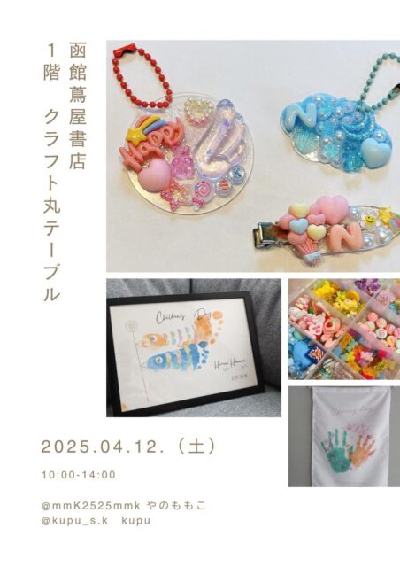 みにはぴ in 函館蔦屋書店 イベント 2025.03.24 2025年4月12日(土) 開催場所 函館蔦屋書店 1階クラフト丸テーブル ✋️手形足形アート👣 🎏こいのぼり ¥1,000〜 🌸春タペストリー ¥500〜 (ご兄弟がふえるごとに各🎏+¥300、🌸+¥100) ※ご予約いただけると、お名前・月齢を印字しお作りいたします キャンディーバッグ・デコキーホルダー・じゃらじゃらキーホルダーも✨ ぜひお気軽に遊びにきてくださいね~♪ 時間 10:00~14:00 お子さんと一緒に素敵なアートやキーホルダー作りませんか? ※このイベントは終了しました※