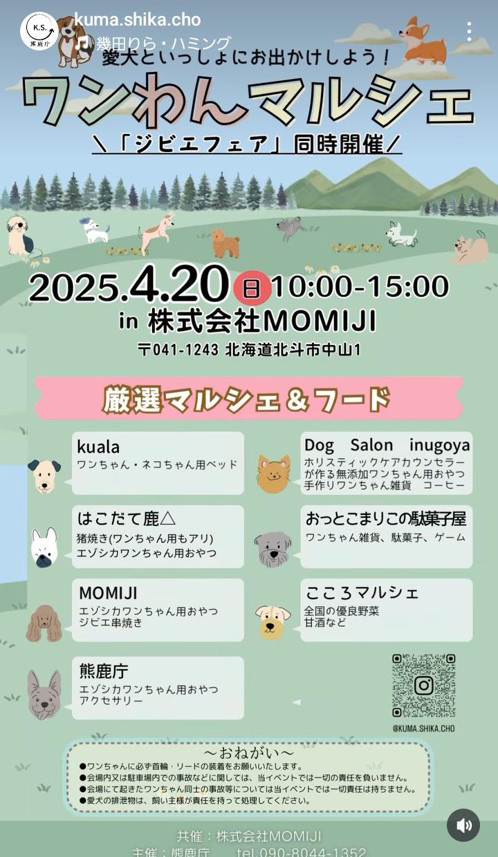 ワンわんマルシェ イベント 2025.04.18 2025年4月20日(日) 開催場所 道の駅なとわ・えさん 愛犬といっしょにお出かけしよう! ワンちゃん・ネコちゃん用のベッドや雑貨、アクセサリーの他、無添加ワンちゃん用おやつなど! 「おっとこまりこの駄菓子屋」も参加♪ 週末は愛犬と一緒にお出かけしてみてはいかがでしょうか?😊 時間 10:00~15:00 ワンちゃんとのお出かけもしやすい季節になりましたね♪ ※このイベントは終了しました※