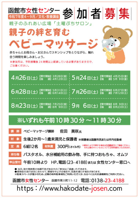 【函館市女性センター】親子の絆を育むベビーマッサージ(9月)