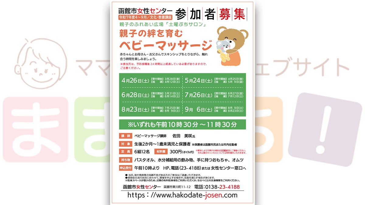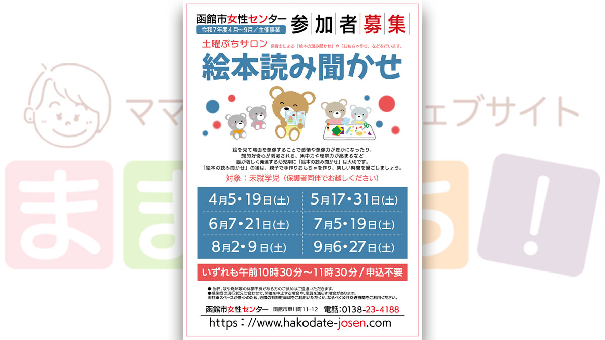 【函館市女性センター】8月の絵本読み聞かせ イベント 2025.07.20 2025年8月2日(土)~2025年8月9日(土) 開催場所 函館市女性センター 開催日 8月2日(土)9日(土) 「絵本の読み聞かせ」の後は、親子で手作りおもちゃ作りもしますよ♪ 親子で楽しい時間を過ごしましょう♪ 時間 10:30~11:30 対象 未就学児(保護者同伴でお越しください) 参加料 無料 申込受付 お申込み不要です。時間内にお越しください。 ※このイベントは終了しました※