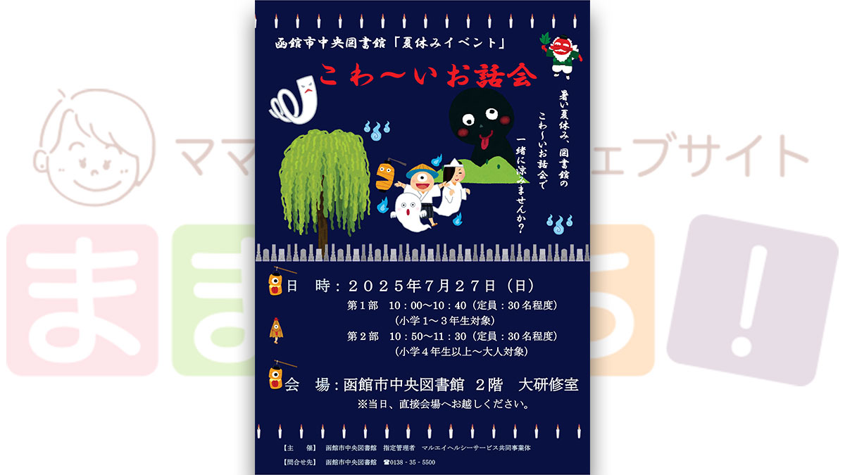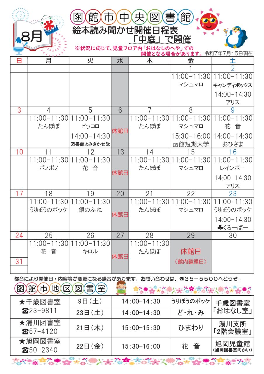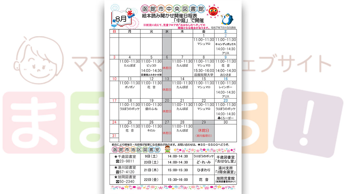 【函館市中央図書館】8月の絵本読み聞かせ日程 イベント 2025.07.18 2025年8月1日(金)~2025年8月28日(木) 開催場所 函館市中央図書館・千歳図書室・湯川図書室・旭岡図書室 函館市中央図書館、函館市地区図書室の2025年8月の絵本読み聞かせ開催日程です♪ 時間 カレンダーをご確認ください。 ※都合により開催日・内容などが変更になる場合があります。 ままっち!でも毎月お知らせしますのでチェックしてお出かけしてね♪ ※このイベントは終了しました※