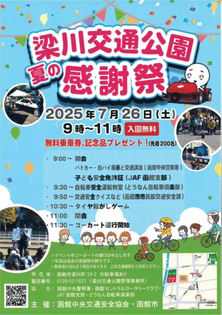 梁川交通公園 夏の感謝祭 イベント 2025.07.22 2025年7月26日(土) 開催場所 梁川交通公園 パトカー、白バイ展示!子ども安全免許証も作れますよ♪ 自転車安全運転教室や交通安全クイズなど楽しいイベントを用意してお待ちしています♪ 先着200名様には無料乗車券、記念品プレゼント! 時間 9:00~11:00 入場料 無料 ※イベント中ゴーカートの運行は中止します。 ※駐車場が混み合う場合があります。公共交通機関をご利用ください。 楽しく交通ルールを学ぼう★ ※このイベントは終了しました※