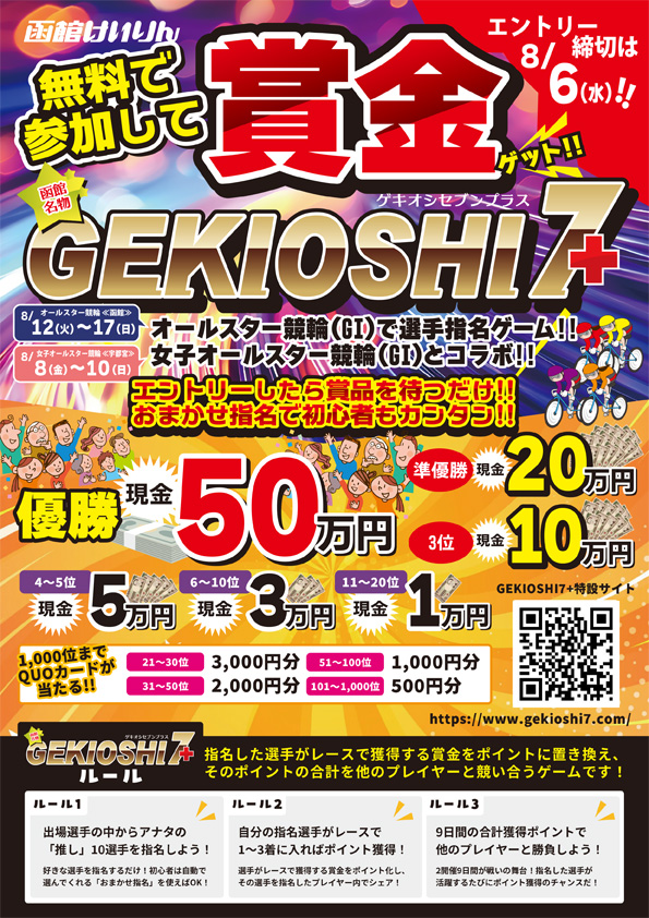 開催を前に初心者でも無料で競輪が楽しめて、運が良ければ優勝賞金50万円が当たる選手指名ゲーム「GEKIOSHI7+(ゲキオシセブンプラス)」の参加者を、8月6日まで募集していますよ~!