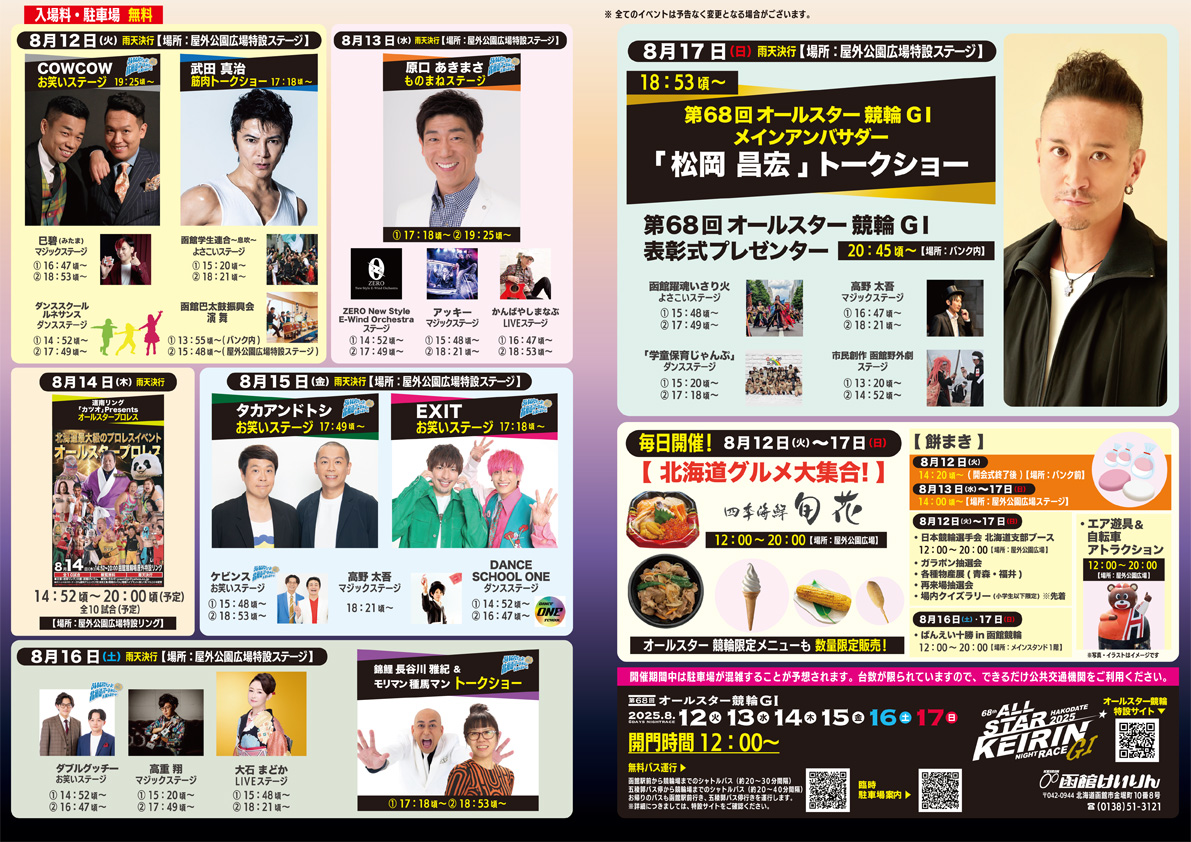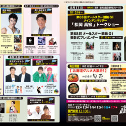 開催期間中の競輪場内では、北海道出身でありメインアンバサダーを務める松岡昌宏さんによるトークショー(17日)のほか、北海道出身の人気お笑いタレントによるステージイベントなどが連日開催!!