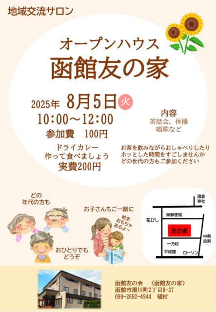 オープンハウス 函館友の家 イベント 2025.08.04 2025年8月5日(火) 開催場所 函館友の家 オープンハウス函館友の家は地域のみなさんの居場所です😊 お茶を飲みながらお喋りして、ホッとした時間を過ごしませんか? ドライカレーの実習を見ていただき、体操などのあと試食をします! お子様とご一緒に、お一人でも、どの年代の方も大歓迎です♪ どうぞ一度お出かけください✨ 時間 10:00~12:00 参加料 参加費:100円、ドライカレーを作って食べたい方は実費200円 ご予約不要!お気軽にどうぞ♪ ※このイベントは終了しました※