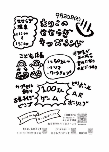 まりこのせせらぎキッズランド イベント 2025.09.18 2025年9月20日(土) 開催場所 北斗市健康センターせせらぎ温泉 キッズとつくるキッズのイベント 函館市の駄菓子屋・おっとこまりこの駄菓子屋プレゼンツ&北斗市の駄菓子屋・だがしやパドックがにぎやかしのW駄菓子屋でお楽しみ下さい😆 こどもたちが店長になって開くフリマやワークショップ!ぜひ応援してね♪ 100円も! 時間 11:00~15:00 \Instagram/ おっとこまりこだがしやパドックロカモエ 子どものお小遣いでも参加できるので、お財布を持たせて行ってみよう! ※このイベントは終了しました※