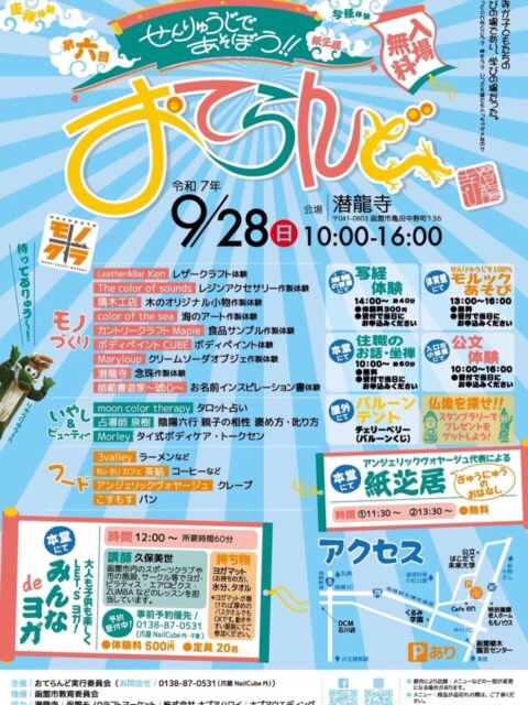 第六回 おてらんど イベント 2025.09.26 2025年9月28日(日) 開催場所 潜龍寺 6年ぶりに「おてらんど」が帰ってくる!! お寺を会場に、モノづくり、癒し&ビューティーコーナー、フードが集合! その他、紙芝居や大人も子どもも参加できるヨガ体験(予約優先)など盛りだくさん! 日曜日はお寺にGO!!! 時間 10:00~16:00 久しぶりの開催!お寺ならではの体験もたくさんですね♪ ※このイベントは終了しました※