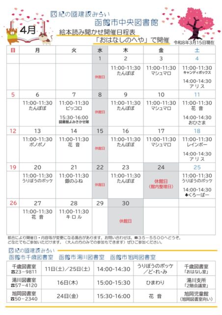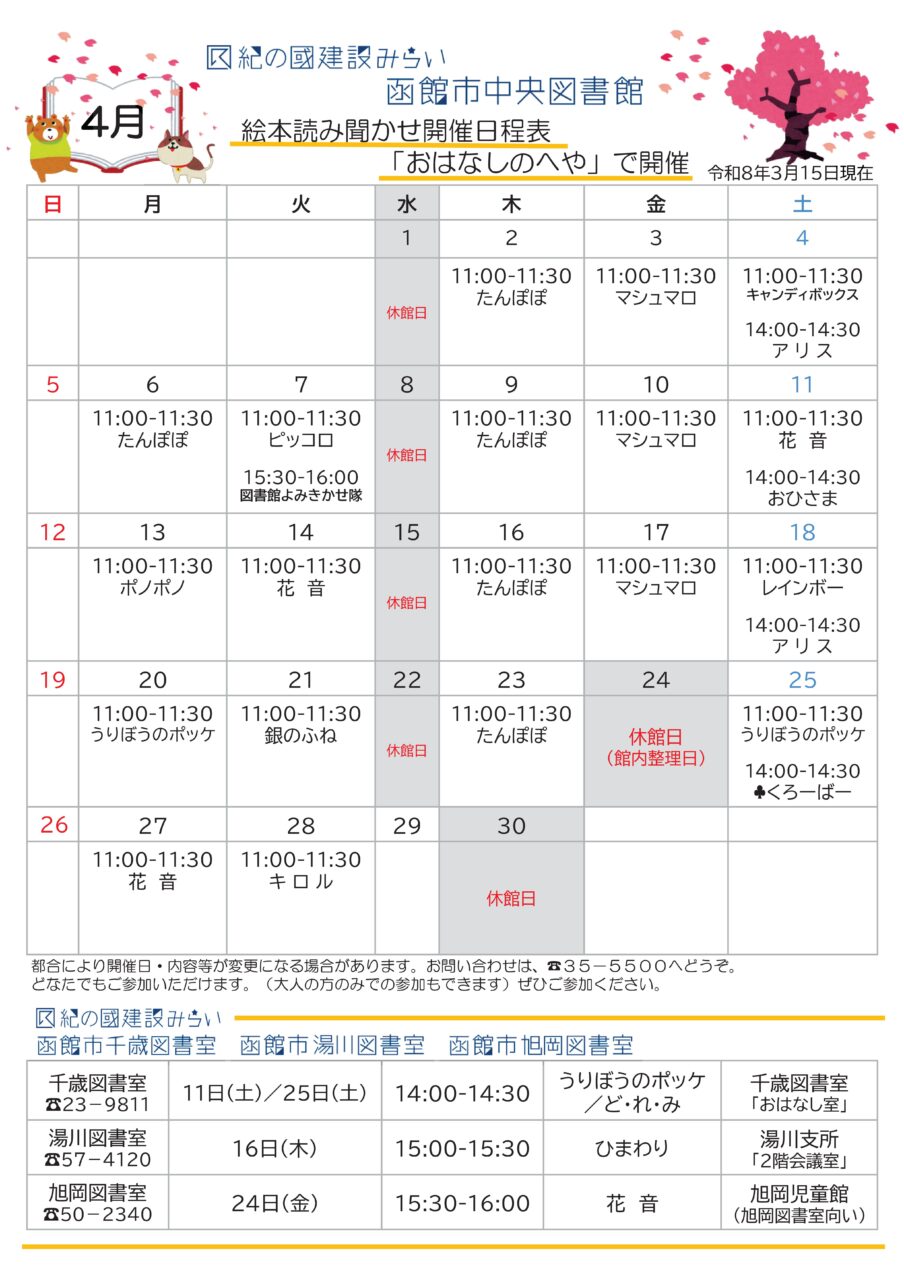 【函館市中央図書館】4月の絵本読み聞かせ日程 イベント 2026.03.23 2026年4月2日(木)~2026年4月28日(火) 開催場所 紀の國建設みらい 函館市中央図書館・千歳図書室・湯川図書室・旭岡図書室 紀の國建設みらい 函館市中央図書館、函館市地区図書室の2026年4月の絵本読み聞かせ開催日程です♪ 時間 カレンダーをご確認ください。 ※都合により開催日・内容などが変更になる場合があります。 毎月ままっち!にて読み聞かせ日程をご案内しています📚 どうぞ気軽に参加してみてくださいね✨ お問い合わせ 函館市中央図書館 電話番号 0138-35-5500
